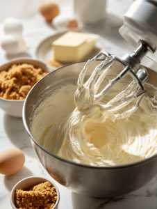 - In a large bowl, use an electric mixer or whisk to cream together softened butter and brown sugar until the mixture is light, fluffy, and pale in color, about 2-3 minutes.