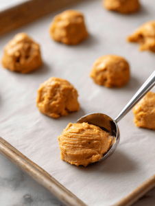 - Using a spoon or cookie scoop, drop spoonfuls of dough onto the prepared baking sheet, spacing them about 2 inches apart to allow for spreading.