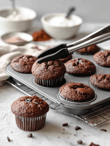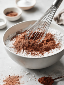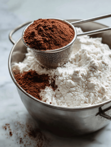 Step 2: In a large mixing bowl, whisk together 2 cups of all-purpose flour, 1 cup of dark cocoa powder, 1 teaspoon baking soda, and a pinch of salt.