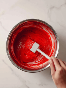 6. Stir in the red food coloring and chili powder, mixing until the vibrant crimson hue is evenly distributed and the batter is smooth.