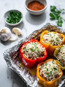 6. Top each pepper with a generous handful of shredded smoked cheese and sprinkle with smoked paprika, creating a smoky, cheesy crust.